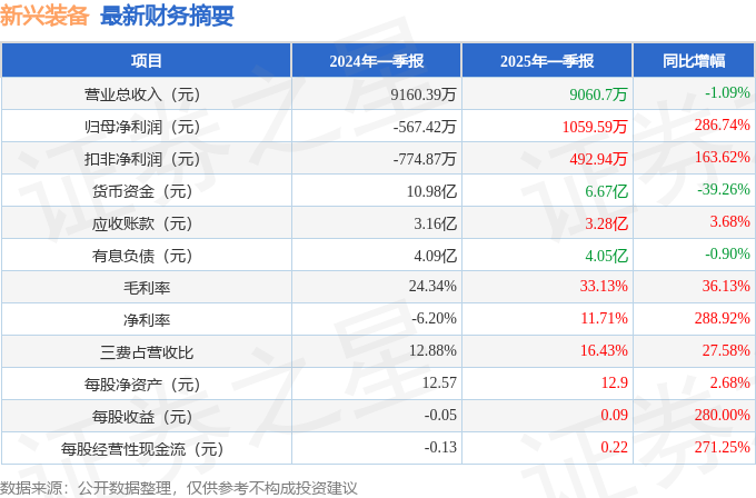 据证券之星公开数据整理,近期新兴装备(002933)发布2025年一季报。截至本报告期末,公司营业总收入9060.7万元,同比下降1.09%,归母净利润1059.59万元,同比上升286.74%。按单季度数据看,第一季度营业总收入9060.7万元,同比下降1.09%,第一季度归母净利润1059.59万元,同比上升286.74%。本报告期新兴装备盈利能力上升,毛利率同比增幅36.13%,净利率同比增幅288.92%。